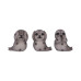 Three Wise Seals figurine set featuring gray spotted seal figures in the classic "see no evil, hear no evil, speak no evil" poses. Made from durable resin with detailed craftsmanship, these decorative pieces add character to any space. The set makes a thoughtful gift for various occasions and appeals to animal lovers and home decor enthusiasts alike. Each seal features unique detailing and personality, making this a special addition to any collection or display area.Three Wise Seals 7.5cm
