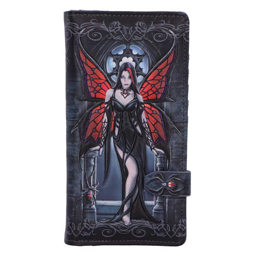 An embossed purse showcasing artwork by artist Anne Stokes, capturing a gothic fairy with black widow-inspired wings and attire. |