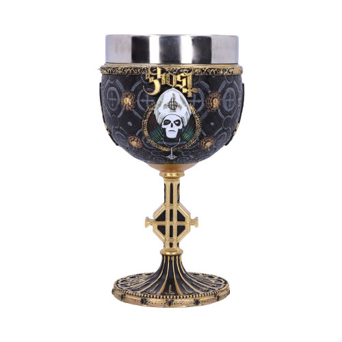 Join the ghastly congregation of Papa Emeritus and Cardinal Copia with this officially licensed chalice, created by Nemesis Now! Detailed in Gold and emblazoned with the face of a supercilious Papa gazing into the abyss, this chalice has been cast in the finest resin before being expertly hand-painted and features a stainless steel insert for ease of cleaning. It's never been easier to show your unwavering devotion with the full collection of Ghost merchandise, painstakingly designed by their very own Nameless Ghouls.Ghost Gold Meliora Chalice