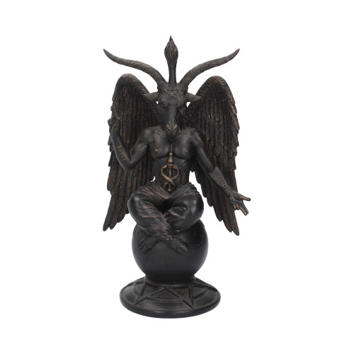 Designed by alternative brand Nemesis Now, this mystical figurine is cast in the highest quality resin before being carefully hand-painted. Resting in the centre of a pentagram, the globe of the earth acts as Baphomet's seat. Sitting cross-legged on top of the world, Baphomet sits, symbolizing the sum total of the universe. Legs ending in cloven hooves, the staff of Asclepius rises from their crotch. Their right arm is raised in a magical blessing with the word SOLVE written on their forearm, while their left arm is stretched downwards and outwards invitingly, forearm bearing the word COACULA. Their triple-horned goat's head stares directly forwards as their wings stretch out behind them. Worshipped by occultists from Jacques de Molay's Templars to Alistair Crowley, Baphomet has long been a symbol of free-thinking heresy and forbidden knowledge.Baphomet Antiquity 25cm
