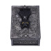 From macabre masters Nemesis Now, this black cat box is any occult enthusiasts dream. With a Black Cat Familiar as the centrepiece sitting atop a horned skull, this piece is the perfect place to store all of your treasured talismans and crystals. Flanking the cat are many dark symbols including two tarot cards, a potion bottle, ouija planchette and pentagram. Given an aged silver finish, this box is cast in the finest resin and would make the perfect addition to any dark altar.Familiar Spell Box 13.7cm