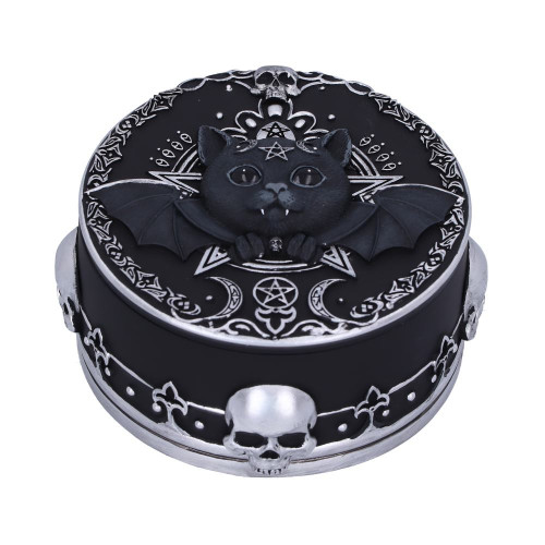 From the bewitching mind of our in house design team comes this Malpuss Trinket Box. Malpuss the union of good and evil features on the lid of the trinket box staring up at you adoringly. As you look into their black eyes you notice the darkness that resides within. The trinket box is decorated in ornate silver detailing and satanic symbology and is cast in the finest resin before being expertly hand-painted. This trinket box is perfect for any gothic lover or collector of Nemesis Now's Cult Cuties range.NN Designs