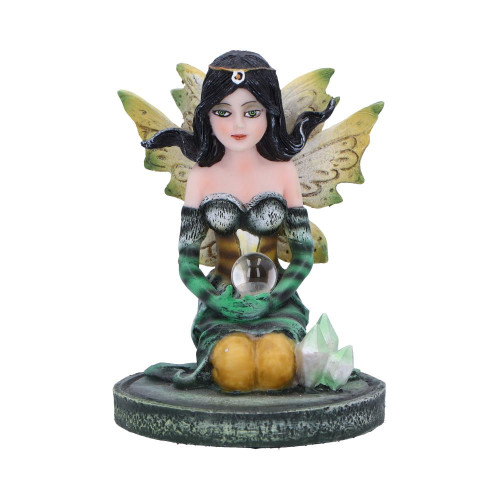 Meet Jade, a captivating fairy figurine cradling a glass ball on her knee, adorned in green and yellow striped clothing with crystals at the base. Standing approximately 9cm tall, she's a perfect addition to any fairy collection. Part of the enchanting Crystal Fairy range, Jade is presented in a vibrant open-fronted box, showcasing her intricate details effortlessly. Jade is an exquisite addition to any collection and would make the perfect gift or memento for those enchanted by fairy tales and fantasy realms.Fairies
