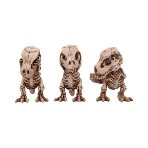 Unique T-Rex Skeletons in See, Hear, Speak No Evil Poses Introduce a gothic twist to prehistoric design with this striking set of Tyrannosaurus rex skeleton figurines, posed in the iconic "see no evil, hear no evil, speak no evil" theme. Combining haunting skeletal detail with timeless wisdom, this set adds an eerie and captivating element to any collection. Each T-Rex skeleton brings one of the famous principles to life: covering its eye sockets, ear spaces, or skeletal jaw. Designed by Nemesis Now's in-house team, these figurines are meticulously cast in high-quality resin and hand-painted to highlight their intricate bone structures and macabre charm. Carefully packaged with multiple layers of protective materials, this set ensures secure delivery, arriving in pristine condition and ready to enhance your shelves. Perfect for fans of gothic dcor, prehistoric artifacts, and collectors of eccentric statement pieces, these skeleton figurines are ideal for gift shops, gothic-themed retailers, and specialty stores looking for unique and memorable products. Offer your customers a bone-chilling take on timeless wisdom with the T-Rex Skeletons in See, Hear, Speak No Evil Poses. A standout, marketable addition to any wholesale collection, these figurines are sure to capture attention and spark conversation.Three Wise Tyrannosaurus Rex Skeletons 9.3cm