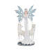 This beautiful Fairy figurine comes from alternative brand Nemesis Now. Standing proudly, this regal Fairy's long white dress flows down to the rocky floor, fur lining the neckline. A tiara encrusted with white diamonds sits atop her long white hair as she looks forward with royal disdain. Her icy blue wings stretch out behind her, the shape of frozen leaves covered in ice, as she places her hands on the heads of the two white wolves at her sides commandingly. Cast in the finest resin before being carefully hand-painted, this statuette is fitting for any queen of the winter.Aura Small 24cm