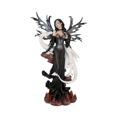 From alternative brand Nemesis Now's giftware collection, this enchanting Fairy figurine is cast in the finest resin before being expertly hand-painted. Standing in front of a small rocky outcrop, this elegant Fairy wears a long black dress, her black wings spread wide behind her. She looks to the side as her long raven-coloured hair tumbles past her shoulders, one delicately gloved hand resting on the brown stone. Climbing the rocks around her, tail curling around her lovingly, a small white Dragon looks up at her with admiration. Perfect for adding a touch of elegance and Fantasy to any space, this fantastic figurine makes a great gift for anyone who keeps their composure in any circumstances.Isabelle 57cm