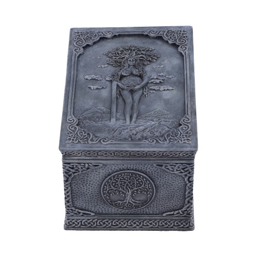 Around the box, a selection of Wiccan symbols and Celtic patterns can be seen. Whilst on the lid Mother Earth stands amongst nature, supporting the world as a pregnant belly between her arms. Cast in the finest resin before being expertly hand-painted, this piece is the perfect piece to keep your most prized possessions safe.