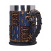Created by Nemesis Now, the main body of the tankard has a repeating pattern of the royal standard of Edward III, with 3 gold lions on a red field quartered with a pattern of gold Fleur-de-Lys arranged on a blue field. A thin gold chain circles the body just above the black base. The handle curls out from the side, black with a slender gold chain wrapped around it, with the top being enveloped in a silver sheath wild curled golden patterns wrapped around it. Cast in the finest resin before being carefully hand-painted, this tankard comes with a removable stainless-steel insert for ease of cleaning.