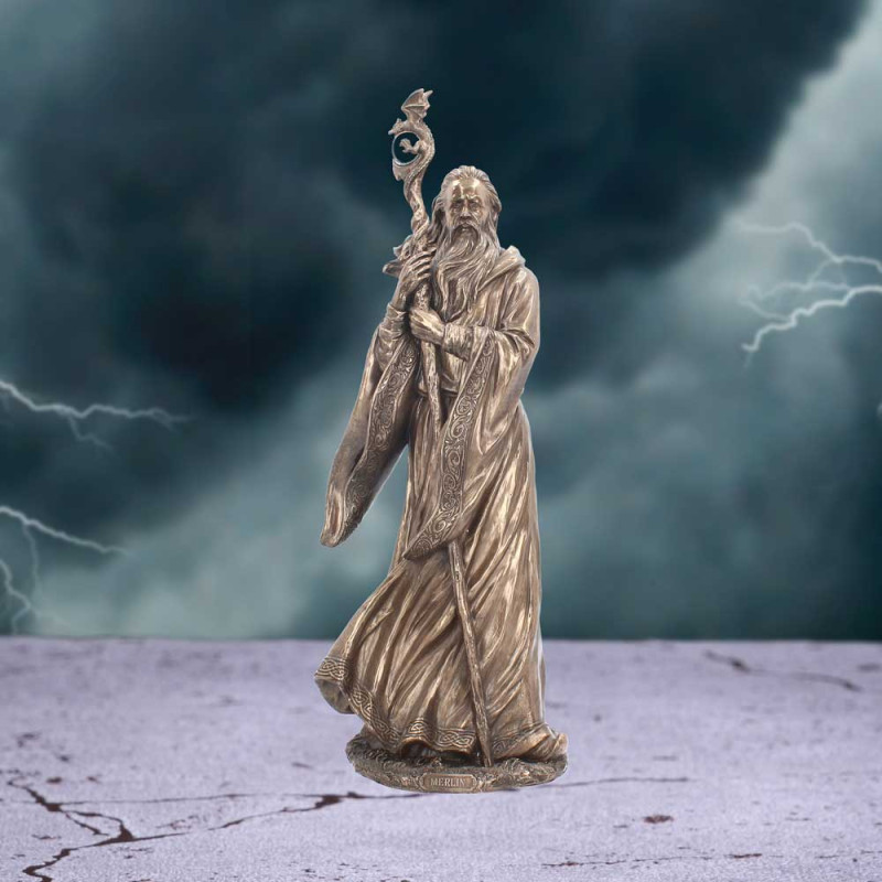 From alternative brand Nemesis Now's giftware collection, this magnificent Merlin statuette can bring magic to any home. Standing tall, the great wizard Merlin stares ahead, robes swept about him by the wind. He clutches his magical staff close, the sacred oak topped by a glass orb. Cast in high-quality resin before being given a bronze finish, this figurine makes a perfect gift for anyone who needs some magic in their life.NN Designs