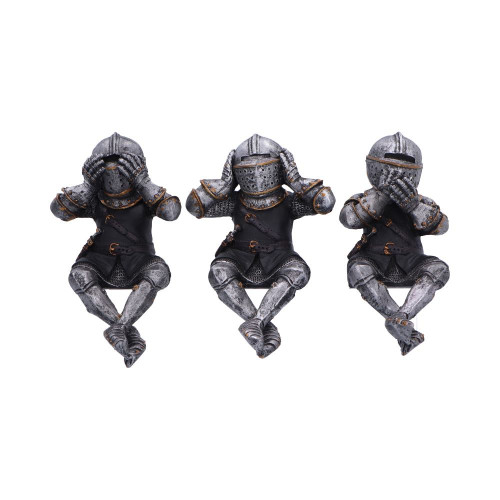 Embark on a journey through medieval charm with our Three Wise Knights (Shelf Sitters), from Nemesis Now's premium collection, 11cm figurines that bring chivalry and wisdom to your decor. Crafted from high-quality resin, these knights are adorned in full armor, including the distinctive Bascinet helmet, showcasing meticulous attention to detail. Sitting with legs crossed side by side, each knight embodies the 'See no evil, hear no evil, speak no evil' proverb, adding a touch of medieval whimsy to your space. The armor is skillfully painted in silver with opulent gold accents, enhancing the regal aesthetic. Perfect for those who appreciate medieval history and whimsical symbolism, these shelf sitters bring an air of gallantry to any setting. Explore our diverse range of medieval-themed giftware, each piece crafted to transport you to a bygone era of knights and noble ideals.