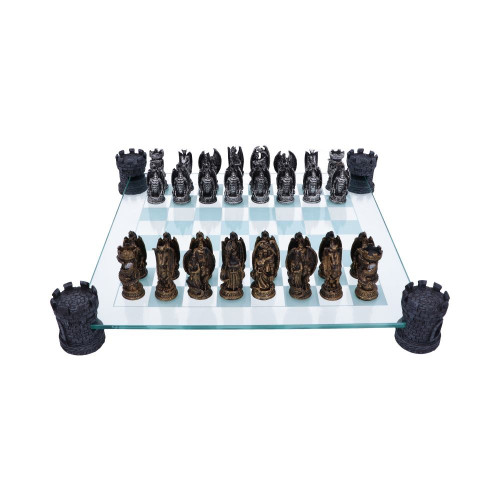 Facing off against each other, two noble armies stand, alike in dignity. One is bronze and one silver, but both field an impressive array of Dragons, soldiers, and fortresses. They stand on a glass checked battlefield, held off the ground by 4 towers. Cast in the finest resin before being painstakingly hand-painted, this chessboard is a fantastic way to challenge your Fantasy-loving friends to a battle of wits and strategy.Kingdom Of The Dragon Chess Set 43cm