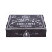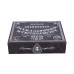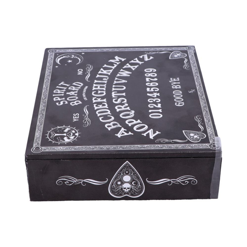 This enchanting jewellery box comes from the imagination of Nemesis Now's in-house design team. Spirit boards have long been one of the most powerful occult tools there is. The edges are bordered with intricate white baroque designs and ornate planchettes. The black background of the box is aged and has the alphabet marked out in an arc on the top. Each side of 'Goodbye', two ornate planchettes are pointing towards the centre, as if ready to move. The design also includes numbers 0 to 9 and the words YES and NO, as well as a warning to use with caution - the power of the spirit world is not something to take lightly.NN Designs