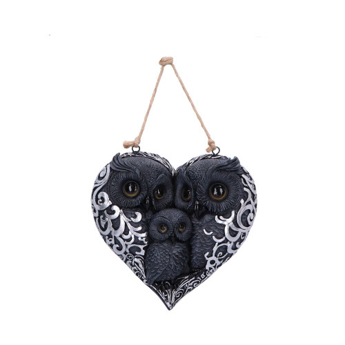Twilight Trio from Nemesis Now is a beautifully crafted wall hanger featuring a family of owls nestled within a heart-shaped plaque. Cast in durable resin and hand-painted with care, it includes detailing and elegant silver accents that bring the design to life. Packaged in a branded box for secure delivery and gifting, it's perfect for owl lovers, fantasy decor fans, and those who enjoy nature-inspired art. Add a touch of warmth, wisdom, and woodland charm to your home with this enchanting piece.Owls
