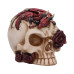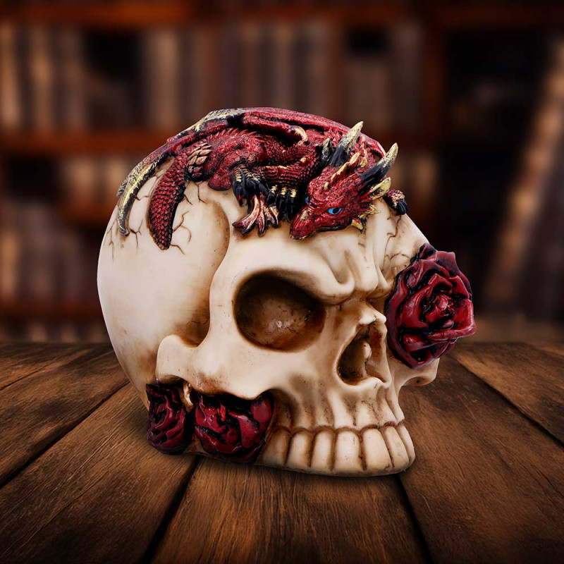 . Hand-painted crimson dragon figurine perched atop a cream-colored skull