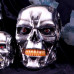 This T-800 Terminator head has shed all human flesh, exposed hydraulics overlaid on a metallic skeletal structure that mocks humanity. Light-up, blinking, red eyes look ahead. Cast in the finest resin before being carefully hand-painted.