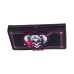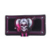 This Little Monster Embossed Purse is inspired by the infamous Harley Quinn. Featuring Little Monster, hair tied up in pigtails, held in place with skull clips, right side dyed candy pink and the left jet black. The back of the wallet shows a dagger heart with the words Cross My Heart Hope To Die. This Little Monster is sure to keep all your cash safe!