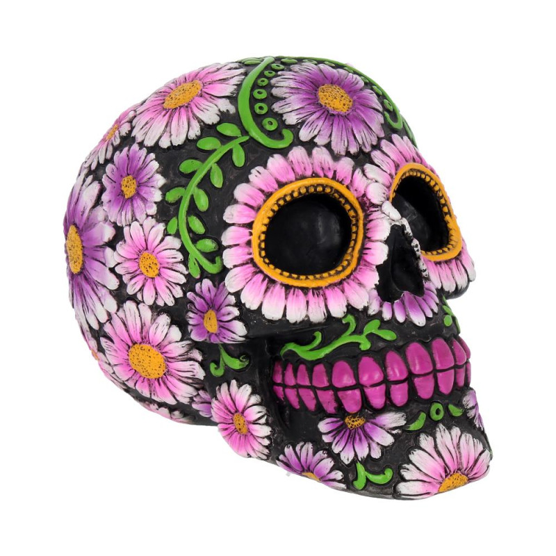 Emblazoned with violet flowers, this black human skull has creeping green vines growing around it, symbolising life being reborn from death. The eyes are highlighted in yellow that matches the pollen of the flowers, and the teeth are a deep purple for an additional splash of colour. Cast in the finest resin before being painstakingly hand-painted, this alternative skull makes the perfect gift for those who need their home protected by the spirits of the dead.Skulls