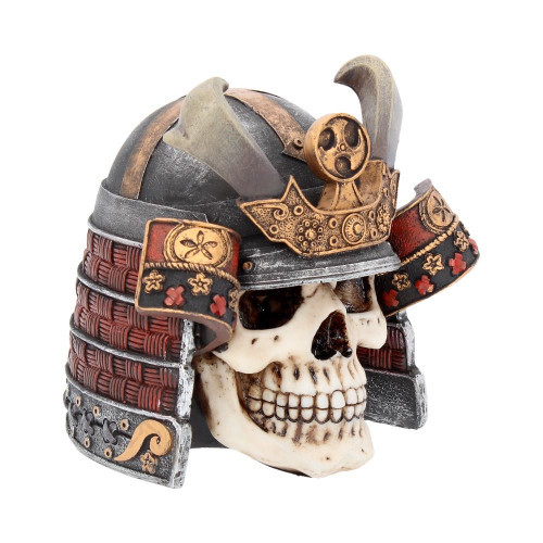 From alternative brand Nemesis Now's giftware collection, this Samurai skull wears a headdress, otherwise known as a Kabuto by these Japanese warriors, that is predominantly red. It is detailed with Gold embellishments, including a pair of protruding horns at the top, centred by a small mitsu tomoe talisman. Cast in the finest resin and painstakingly hand-painted, it would make the perfect gift for any budding Samurai.Skulls