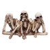 | . | A darkly whimsical take on the classic see no evil, hear no evil, speak no evil proverb, featuring three intricately detailed skeleton figurines. |