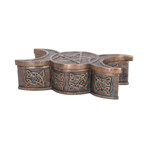 Whether you're seeking a unique storage solution or a decorative piece infused with spiritual symbolism, this Triple Moon Trinket Box is the perfect choice. Embrace the lunar energy and its transformative power as you entrust your treasures to this enchanting box. Let it become a cherished part of your daily rituals, a tangible reminder of the cycles of life, and a symbol of the magic that resides within you. Cast in high-quality resin before being expertly finished in bronze.Witchcraft & Wiccan